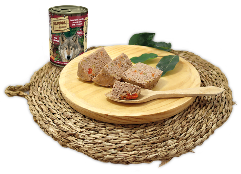 Natural Greatness CONEJO CON VENADO, ZANAHORIAS, ACEITUNAS Y AMARANTO es una excelente receta húmeda completa, ultra premium e hipoalergénica, formulada sin cereales y desarrollada idealmente para perros adultos. Este alimento húmedo posee una alta palatabilidad gracias a la gran calidad de sus ingredientes, entre los que destaca el conejo con venado como única fuente de proteína animal, una carne deliciosa para los paladares más exigentes. Además, esta rica carne va acompañada de superalimentos tales como las zanahorias,aceitunas y el amaranto, que mejoran el sabor y aportan vitaminas y minerales extra para completar esta rica y nutritiva receta de alimento húmedo para perros adultos.